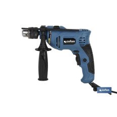 Tensión nominal: - 230 V | Frecuencia asignada: - 50/60 Hz | Potencia: - 600 W (4,6 A) | Velocidad sin carga: - 0-2.800 RPM | Tamaño del mandril: - Ø broca 13 mm | Máxima perforación: - Acero: 10 mm, madera: 20 mm, hormigón: 13 mm