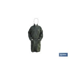 Abrigo de lluvia disponible en color verde. Sus costuras van termoselladas, cuenta con una capucha escamoteable en la zona del cuello, cierre por cremallera y tapeta antifrío. Dispone de puños interiores elásticos y dos bolsillos con tapa. Tallas disponibles desde la S a la XXXL. Puede usarse para días lluviosos o para cualquier deporte como senderismo o pesca. Muy ligero, resistente y flexible.