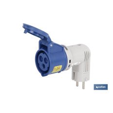 Adaptador de conversión móvil industrial. IP44. Corriente y tensión nominal de 16 A - 250 V. Resistencia al fuego de las partes activas (ensayo del hilo incandescente 750 °C). Muy recomendable para su uso en exteriores como jardines, agrícola o campings.