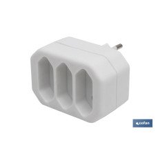 Adaptador triple con 2 puntos de conexión, 10 A 250 V~. Color blanco. Máxima potencia: 2300 W. Aplicaciones habituales: entorno doméstico o el interior de locales del sector terciario (viviendas, oficinas, comercios, etc.).