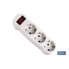 Adaptador triple frontal Schuko con interruptor de encendido/apagado, 2 puntos de conexión y toma de tierra, 16 A 250 V~. Color blanco. Máxima potencia: 3680 W. Aplicaciones habituales: entorno doméstico o el interior de locales del sector terciario (interior de vivienda, oficinas, comercios, etc.).