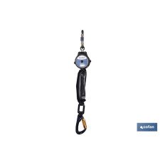 Anticaída retráctil con cable de 2 m. Cuenta con una carcasa fabricada en polímero de alta resistencia con cable de acero galvanizado ø4,5 mm. Sistema de freno con fuerza de impacto inferior a 6 kN. Incluye un absorbedor de energía. Aguanta 140 kg máximo. Es un equipo de protección individual contra caídas, diseñado para frenar y reducir el golpe que generará el frenado de la misma, sin que el cuerpo del usuario sufra daños.