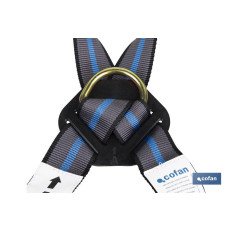 Arnés anticaídas con 2 puntos de enganche esternal y dorsal. También la parte de los muslos es ajustable y la correa de asiento es idónea para una mayor comodidad y ergonomía a la hora de utilizarlo. La parte de los hombros y los muslos están diferenciadas en dos colores. Soporta un peso de hasta 140 kg. El arnés pesa 0,79 kg es muy ligero y cómodo para transportar. Está fabricado en tejido de poliéster de muy buena calidad.