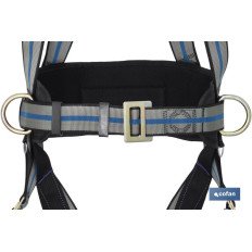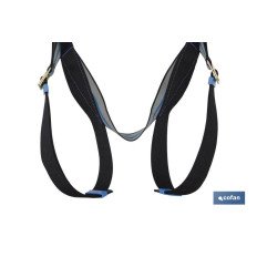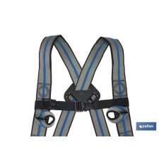 Arnés anticaídas con 2 puntos de enganche esternal/dorsal. Su cinturón de posicionamiento va equipado con 2 hebillas portaherramientas laterales y 1 anilla portaherramientas en el cinturón para añadir el mosquetón. Los muslos y los hombros están diferenciados por dos colores. Puede soportar hasta 140 kg de peso. Los muslos y la cintura son ajustables con correa de asiento para una mayor comodidad y sujeción. Es muy cómodo y fácil de utilizar. Es de muy buena calidad, garantizando la seguridad del usuario en todo momento.