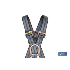 Arnés anticaídas para trabajos en suspensión. Las zonas de los muslos y cinturón de posicionamiento son ajustables para una mayor comodidad. Las cintas de los hombros, muslos y cinturón de posicionamiento están equipadas con hebillas de ajuste.