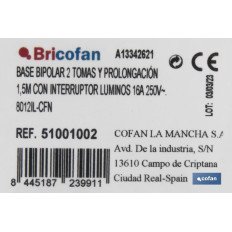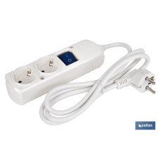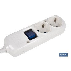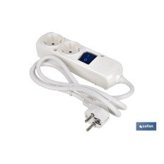 Base eléctrica múltiple de dos tomas para enchufe y con conmutador luminoso para el encendido y el apagado. También se denomina regleta bipolar, con dos enchufes y un cable de sección de 3G 1 x 5 mm2 y longitud de 1,5 metros. En color blanco. Apto para uso doméstico y profesional. Máxima potencia de 3680 W. 16 A - 250 V.