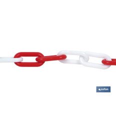 Cadena de plástico en color rojo y blanco, com medida en diámetro de 8mm. Disponible en rollos de 30 metros de longitud.