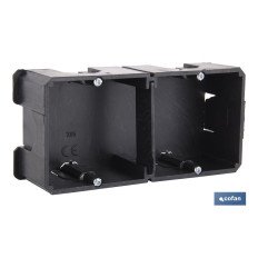 Caja de mecanismos de empotrar. Para 1, 2 y 3 elementos. Universal. Enlazable. Certificada por AENOR. Dispone de varias dimensiones para empotrar en mm. Con múltiples entradas para tubo Ø 25 mm. Aplicaciones habituales: Entorno doméstico/terciario interior (Interior de vivienda, oficinas, comercios, etc.), mayormente utilizado en tabiques huecos o pladur. Color negro de la caja.