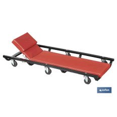 Camilla para trabajos mecánicos con cabecera ajustable. Plataforma con ruedas para talleres, disponible en color rojo y negro (estructura). Sus medidas son de 1030 x 440 x 110 mr. Cuenta con 6 ruedas. El reposacabezas acolchado es ajustable para una comodidad de trabajo óptima. Su diseño de perfil bajo la hace ideal para reparaciones debajo de vehículos o en cualquier momento que necesite acostarse sobre su espalda. La plataforma es fácil de limpiar y es resistente al aceite y a disolventes
