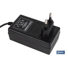 Cargador apto para batería recargable Cofan Li-ion 25 V 2.0 Ah (referencia 5003501.01).Dispone de dos cables para poder cargar dos baterías simultáneamente.Incluye un indicador LED, el cual se iluminará de color rojo mientras se cargan las baterías y en color verde una vez la carga se haya completado al 100 %.Esta operación puede completarse en 1 o 2 horas.Nº RII-AEE de Cofan La Mancha: 7038.