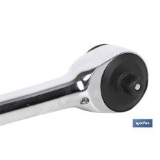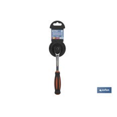 Carraca con doble funcionamiento de apriete, girando el mango y con el apriete habitual. Botón de liberación rápida. Mecanismo intercambiable de uso fácil. Fabricado en Cromo/vanadio. Cabezal cuadrado de Cromo Molibdeno. Mango bimaterial. La carraca permite un apriete muy preciso mediante el sistema habitual y con el sistema de giro continuado del mango. Habitual en mecánicos, construcción, lugares de espacios reducidos. Fabricada con materiales de alta calidad.