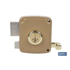 Cerradura sobreponer. Palanca de acero. Cilindro redondo más 3 llaves (2 vueltas). Cerradero y escudo incluido. Picaporte y tirador interior. Acabado esmaltado. Contiene tornillos para la fijación.