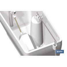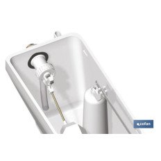 Cisterna completa de tanque alto equipada con grifo flotador lateral que puede usarse tanto a derechas como a izquierdas. Esta cisterna está fabricada en ABS con tratamiento antienvejecimiento que permite una mayor duración y menor desgaste.