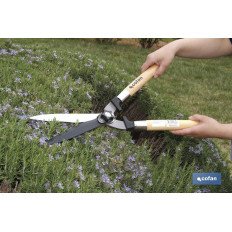Cizalla corta-setos profesional con cuchillas autoafilables en acero forjado de 22 cm de longitud y regulación de tensión de cuchillas. Ideal para cortar setos y ramas gruesas. Sus cuchillas están cubiertas con un revestimiento antiadherente y sus empuñaduras de madera son ergonómicas. Su diseño y constitución están orientados a un uso intensivo y aportan al producto una larga vida útil. Esta cizalla puede ser utilizada para uso doméstico y profesional. Sus hojas afiladas favorecen al corte limpio y sin esfuerzo excesivo. Sus propiedades y características profesionales convierten la actividad del corte de arbustos y setos en un proceso cómodo de llevar a cabo.