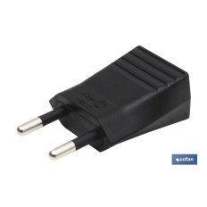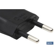 Clavija bipolar de 10 A Clase II, de espigas de 4 mm de Ø sin toma de tierra. 250 V~. Color negro. Material de fabricación termoplástico.