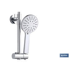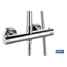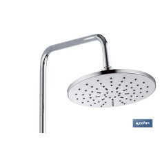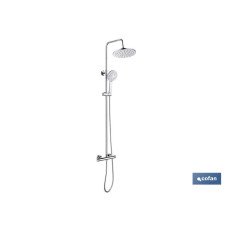 Columna de ducha redonda para baño con 5 funciones de hidroterapia. El kit incluye un mango con 5 posiciones de hidroterapia, 1 flexo extensible inoxidable, 1 barra deslizante, 1 rociador superior y 1 grifo termostático para regular la temperatura agua. Sus medidas son: el cabezal de ducha 22,5 cm el mango 12 x 25,5 cm el flexo extensible medida 1,5 cm la barra deslizante, regulable a distintas alturas, rociador superior, jabonera y grifo, medida de 80 a 115 cm. El producto está fabricado en ABS cromado. Este sistema de columna de ducha es muy fácil de montar e instalar en su hogar.