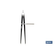 Compás de puntas con muelle. Cuenta con una tuerca de ajuste rápido en uno de sus laterales. El compás se utiliza para tomar medidas sobre la superficie de cualquier material y para trazar arcos de circunferencia. Una de las puntas se utiliza como centro de la circunferencia y con la otra se marca el arco. El compás es de color negro y plateado. Tiene varias medidas desde los 150 mm hasta los 300 mm.