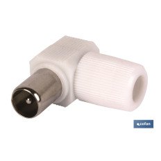 Conector adaptador de antena de televisión, en forma de codo, con salida de cable vía macho. Longitud total de la pieza de 9,5 mm. Apto para conectar la televisión mediante cable de antena.