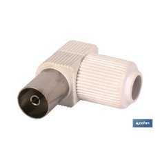 Conector de antena de TV con forma de codo. Vías de entrada macho-hembra. Longitud 9,5 mm. Color Blanco.