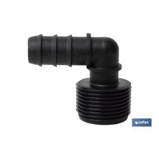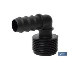Conector en forma de Codo y rosca para mangueras especial para riego por goteo o aspersión. Su uso está recomendado para jardinería y agricultura. Su diseño permite un uso fácil para adaptarlo a mangueras o tubos de riego. Gracias al conector de empalme mixto se pueden llevar a cabo distintos tipos de riego sin necesidad de herramientas adicionales. Está fabricado en material resistente y diseñado para ser utilizado bajo condiciones meteorológicas adversas. Su montaje es fácil de llevar a cabo. La rosca de uno de sus extremos es consistente y habilita un roscado fijo y fuerte.