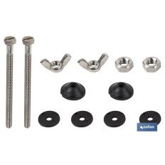 Juego de tornillos para una perfecta fijación de la cisterna al inodoro. Este juego es universal y apto para todos los inodoros y cisternas. Este juego se compone de dos tornillos M6 x 90 con sus arandelas, juntas y palomillas. Perfecta sujeción, calidad y durabilidad. Los tornillos se encuentran fabricados en acero inoxidable.