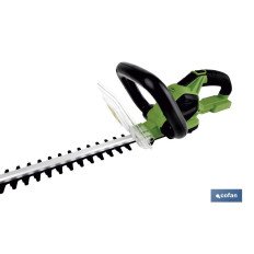 Cortasetos eléctrico a batería. La batería es de Litio Li-ion de 18 V. Longitud de la cuchilla de 51 cm y con accionamiento de seguridad. Realiza 2.200 cortes por minuto. Tiene un diseño compacto y muy ligero, es ideal para trabajos de larga duración. El diseño de la empuñadura proporciona mayor confort y control de la herramienta. Es adecuado para setos medianos y grandes, permite cortar ramas muy grandes sin necesidad de herramientas secundarias. Contiene batería y cargador. Nº REI-RAEE de Cofan La Mancha: 7038.