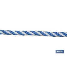 Cuerda trenzada helicoidal 100% polipropileno color azul/blanco, realizada con alma trenzada en 8 cabos y 24 cabos en granete. Cuerda trenzada en diámetros desde 6mm hasta 16 mm. Cuerda muy flexible y suave al tacto.