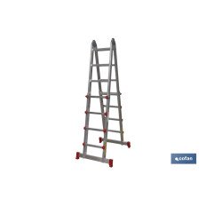 Escaleras multiposición de Aluminio con certificado EN131 y resistencia a 150 kilos máximo. Con 4 tramos y 4 o 5 peldaños en cada tramo. Ancho de 40 cm. Reforzada por bisagras y asegurada por cierres de seguridad. La forma de la escalera puede ser fácilmente modificada. Buena estabilidad, con barras estabilizadoras en ambos extremos, pies antideslizantes y escalones acanalados. Ideal para pintar paredes, colgar luces y limpiar aleros, etc.