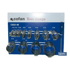 Expositor para 120 abrazaderas + destornillador flexible. Fleje 9 mm y 12 mm. Medidas de 8-12 hasta 70-90. También tiene la posibilidad de conseguir únicamente el expositor (material no incluido).