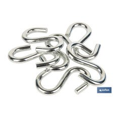 Gancho en S zincado ideal para la colocación de objetos en barras o cornisas. También usado para empalmes de cadena de pequeño calibre.
