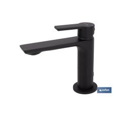 Grifo monomando negro para lavabo con embellecedor. El cuerpo está fabricado en latón y el mando en aleación de zinc con acabado negro mate.Su cartucho cerámico de alta calidad tiene una medida de 25 mm diámetro y el aireador premium una métrica de 24 para permitir un ahorro de agua de más de un 40 %. El embellecedor de la base está fabricado con latón negro y los latiguillos flexibles son de acero inoxidable 304 (medidas 35 cm con rosca M8* F3/8).El grifo monomando negro incluye el kit de instalación. Medidas completas del grifo monomando: 14,8 x 15,7 x 5,5 cm.