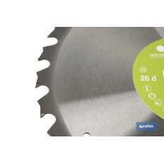 Disco para madera y metal adecuado para utilizarse con sierras ingletadoras. Esta hoja de sierra ingletadora está fabricada en material de aleación de metal duro de alta calidad. Tiene buena resistencia a la presión y al desgaste. La superficie del disco está tratada con un revestimiento antioxidante que garantiza una mayor vida útil de la hoja. También puede aplicarse en sierras de inglete, sierras de mesa, sierras de corte, sierras de paneles y en sierras circulares de mano inalámbricas. El disco es adecuado para cortar vigas de madera, madera dura, paneles sándwich y metales con clavos. Puedes adquirirlos con 24, 28 o 32 dientes y diferentes medidas de diámetro. El grosor es de 2,2 mm y cuentan con un eje central de 30 mm.