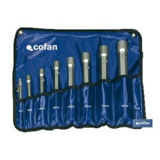 Juegos de llaves de tubo de doble boca totalmente huecas, en juegos de 8 y 12 piezas. Llaves fabricadas en acero al cromo-vanadio, dándole larga vida, resistencia a la deformación y alta capacidad de esfuerzo. Llaves para usos industriales exigentes en los que se necesite un gran esfuerzo de apriete. Herramientas óptimas para trabajar con tuercas de difícil extracción, escondidas y rebajadas. Llaves de tubo huecas con agujero para barra especial.