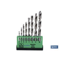 Juego de Brocas para madera profesional de tres puntas. en acero rápido rectificada con punta de centrado y labios de corte. Medidas desde 3mm hasta 10mm.