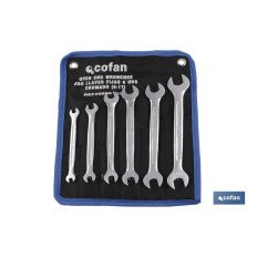 Llaves fijas de doble boca pulidas. Prácticas llaves combinadas con mango seguro y estable. El material en que Están fabricadas es acero al cromo de alta calidad y resistencia lo que permite una mayor vida útil del producto. Disponemos de diferentes juegos de llaves con diferentes medidas. La utilidad de este tipo de llaves radica en aflojar o apretar tuercas y tornillos. El juego puede ser de 6, 8, 10 o 12 piezas.