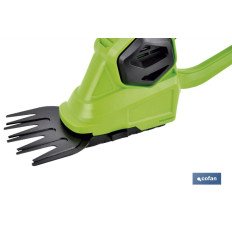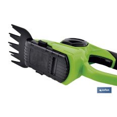Kit Cortasetos/Césped de mano, extensible y con ruedas a batería. Es muy práctico gracias al diseño ergonómico y al peso reducido, obtiene así la máxima comodidad durante el deshierbe o poda. Además ocupa muy poco espacio, es fácil de transportar y manejar. La potencia de la batería de Li-ion es de 18 V. Contiene batería y cargador. Permite trabajar con la herramienta durante 1 hora. Nº REI-RAEE de Cofan La Mancha: 7038. El sistema de las cuchillas es intercambiable para hacerlo más fácil y rápido.