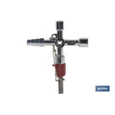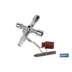 Llave de cabina de 4 brazos fabricada en aleación de zinc cromada y diseñada para cumplir con todos tus requisitos en sistemas de paso en construcción y mantenimiento. Esta herramienta esencial es perfecta para trabajar en cuadros eléctricos, sistemas de calefacción, fontanería, climatización, ventilación, electrotécnica, suministro de gas y de agua, sistemas de bloqueo, etc. Equipada con 10 perfiles diferentes, incluyendo 3 cuadrados de 5, 7 y 8 mm (dos de ellos en el centro), una punta plana de 7 mm, una punta Phillips PH2, un triángulo de 10 mm, 1 cono progresivo de cuadrado macho de 6, 7, 8 y 9 mm y 1 adaptador de puntas de 1/4, esta llave te garantiza una adaptabilidad máxima. Incluye también una cadena para mantener organizados el adaptador de plástico para puntas y una punta con doble huella. Cuenta con un cuadradillo central diseñado para poder ejercer más fuerza. Con un diseño compacto y una longitud total de 8,5 cm, esta herramienta es fácil de manejar y perfecta para cualquier caja de herramientas. Medidas: 8,5 cm de largo, 6 cm de ancho y 1,40 cm de alto.
