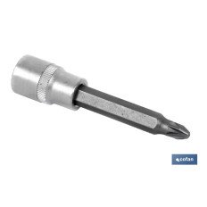 Llave de vaso de 1/2"" con punta larga Pozidrive. Fabricada en acero al cromo vanadio de alta dureza y buena resistencia al desgaste. Este tipo de llave de alta resistencia es excelente para aumentar la potencia de rotación. Se puede ajustar, cambiar y soltar rápidamente. Se puede utilizar para bricolaje doméstico, carpintería, mantenimiento mecánico, etc. Es adecuada para taladros eléctricos, neumáticos y otras herramientas. Disponible en diferentes medidas.