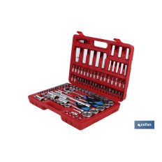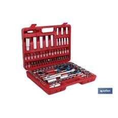 Juego de carraca multiherramienta 108 piezas en maletín de plástico con cierre metálico, incluyendo carracas, extensibles, accesorios y vasos de torx en 1/4" y 1/2".Calidad profesional.