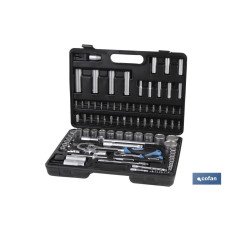 Juego de carraca multiherramienta 94 piezas en maletín de plástico incluyendo carracas, extensibles, accesorios y vasos en 1/4" y 1/2".