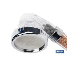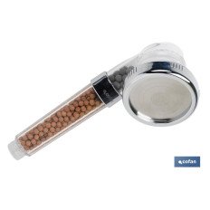 Mango de ducha con filtro iónico y esferas de minerales que emiten iones negativos que purifican el agua, regulan el pH y absorben los restos de cal. El cabezal tiene unos agujeros muy finos que permiten suavizar el agua para darte una buena experiencia de ducha SPA bajo los chorros relajantes. Las esferas incluidas se componen de dos tipos de minerales: unas esferas rojas que mineralizan el agua, aportando beneficios para la piel y unas esferas grises de turmalina que contribuyen a la regularización del pH del agua. Además de purificar el agua y filtrar tanto el cloro como las impurezas, estos minerales permiten mejorar la suavidad de la piel y del cabello, purificar el agua de la ducha, así como proporcionar una sensación de frescura en todo el cuerpo. Puede ahorrar hasta un 30 % de agua. Este mango de ducha está fabricado en acero inoxidable y ABS, e incluye una conexión estándar para la tubería.El cabezal es fácil de instalar, por lo que solo tienes que conectar la tubería a la ducha y girarla en el sentido de las agujas del reloj. También cuenta con tres funciones: lluvia, chorro y masaje. Tiene unas medidas de 22,5 cm de largo y un diámetro del cabezal de 7,9 cm. Peso: 249 g.
