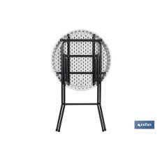 Mesa alta plegable redonda de color blanco fabricada en polietileno de alta densidad (HDPE) y estructura de acero pintado. Esta mesa se ha diseñado para ofrecer durabilidad y resistir las condiciones más exigentes tanto en interiores como en exteriores. Soporta temperaturas extremas, así como la humedad y los rayos UV, por lo que ofrece resistencia durante todo el año. Su diseño plegable, fácil de abrir y cerrar, permite su almacenamiento con facilidad, ocupando poco espacio cuando no está en uso. Además, incluye un asa integrada que facilita su transporte. Cuenta con unos travesaños y unas patas resistentes, y una base fija de 45 mm de grosor. Ideal para eventos o celebraciones, así como mesa auxiliar en jardines, camping, terraza, jardín, trabajos especiales, etc. Medidas cerrada: 80 x 100 x 7 cm. Medidas abierta: 80 cm de diámetro y 110 cm de altura. Peso neto de 9,4 kg.