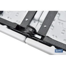 Mesa plegable rectangular de color blanco fabricada en polietileno de alta densidad y con estructura de acero pintado. Ideal para eventos o celebraciones, así como para disponer de una mesa ocasional en jardines, camping, trabajos especiales, etc., ya que es apta para interior y exterior. Soporta temperaturas extremas y, además, es impermeable y resistente a los rayos UV. Es una mesa robusta, fácil de abrir y de cerrar, que ocupa poco espacio cuando esta plegada. Incluye un asa para un fácil transporte. Cuenta con travesaños ergonómicos y un tablero articulado de 45 mm de grosor para un óptimo almacenaje, con auto-lock o bloqueo automático diseñado para evitar que la mesa se pliegue de forma accidental. Ideal para 6/8 personas y soporta un peso máximo de 150 kg.Medidas de la referencia 43051041: DESPLEGADA: 180 cm de largo, 75 cm de ancho y altura desde el suelo 72 cm. PLEGADA: 90 x 37,5 x 9 cm. Peso neto de 14 kg. Medidas de la referencia 43051011: DESPLEGADA: 180 cm de largo, 70 cm de ancho y altura desde el suelo 72 cm. PLEGADA: 90 x 70 x 9 cm. Peso neto de 13 kg.