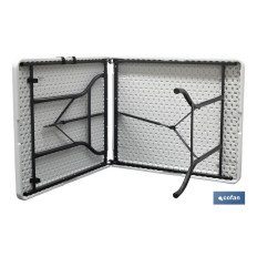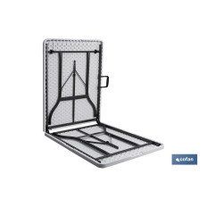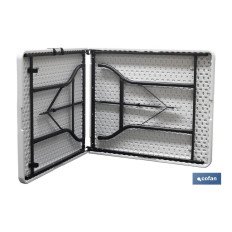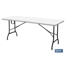Mesa plegable rectangular de color blanco fabricada en polietileno de alta densidad y con estructura de acero pintado. Ideal para eventos o celebraciones, así como para disponer de una mesa ocasional en jardines, camping, trabajos especiales, etc., ya que es apta para interior y exterior. Soporta temperaturas extremas y, además, es impermeable y resistente a los rayos UV. Es una mesa robusta, fácil de abrir y de cerrar, que ocupa poco espacio cuando esta plegada. Incluye un asa para un fácil transporte. Cuenta con travesaños ergonómicos y un tablero articulado de 45 mm de grosor para un óptimo almacenaje, con auto-lock o bloqueo automático diseñado para evitar que la mesa se pliegue de forma accidental. Ideal para 6/8 personas y soporta un peso máximo de 150 kg.Medidas de la referencia 43051041: DESPLEGADA: 180 cm de largo, 75 cm de ancho y altura desde el suelo 72 cm. PLEGADA: 90 x 37,5 x 9 cm. Peso neto de 14 kg. Medidas de la referencia 43051011: DESPLEGADA: 180 cm de largo, 70 cm de ancho y altura desde el suelo 72 cm. PLEGADA: 90 x 70 x 9 cm. Peso neto de 13 kg.
