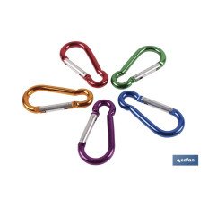 Mosquetones de aluminio en varios colores aleatorios. Mosquetón de aluminio de 5 x 50, 6 x 60, 7 x 10 y 9 x 80 mm.