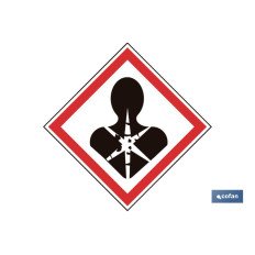 Señalización Adhesivos Residuos Tóxicos PELIGRO PUEDE PRODUCIR LESIONES RESPIRATORIAS. Medidas 100x100 mm. El diseño de la señal puede variar, pero en ningún caso se variará el significado de la misma.
