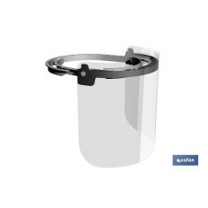 Pantalla facial protectora reutilizable de solidez incrementada que proporciona una barrera física frente a gotas y salpicaduras de líquidos según Reglamento (UE) 2016/425 sobre los EPI y Norma europea EN 166 (1) de protección ocular. La visera facial está compuesta por una banda de cabeza de polipropileno, un armazón de polietileno de alta densidad, una almohadilla anti-transpiración y un visor de policarbonato de 500 micras de alta transparencia clase óptica 1. Esta pantalla facial cuenta con un visor abatible en 90° ultra ligero.