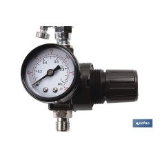 Pistola gravitatoria de pintar sistema HVLP, con regulador aire-pintura en gatillo. Incluye un regulador de presión a la entrada de la pistola. Alta transferencia del producto incluso con poca salida de aire. Fabricado completamente en acero inoxidable. Compatible con pinturas al agua.