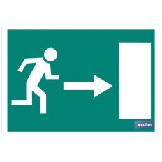 Señal de Evacuación de salida de emergencia puerta derecha. Señal en Pictograma. Tamaño y material a elegir (luminiscente y adhesivo). El diseño de la señal puede variar, pero en ningún caso se variará el significado de la misma.