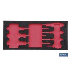 Separador espuma destornilladores Phillips (1/3 cajón) Ideal para optimizar y organizar su espacio de almacenamiento de herramientas. Fabricado en espuma especial para la incrustación de herramientas. Adaptable para carros de herramientas Cofan. Medidas 393 x 180 mr. Cada usuario puede crear la combinación óptima . Totalmente adaptable a una tercera parte del cajón de herramientas cofan